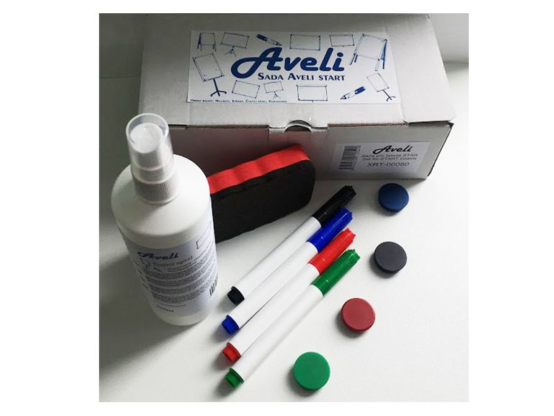 "Základní sada pomůcek k popisovacím tabulím. Sada obsahuje: 4 barevné popisovače na bílé tabule, čistící 250 ml sprej, 6 kulatých magnetů o průměru 24mm , 1 magnetická stěrka.