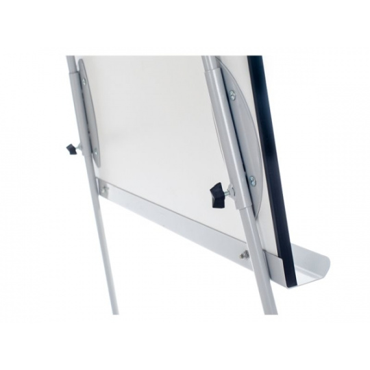 Flipchart s magnetickým povrchem. Flipchart disponuje bočními vyklápěcími lištami pro zavěšení potřebných materiálů.