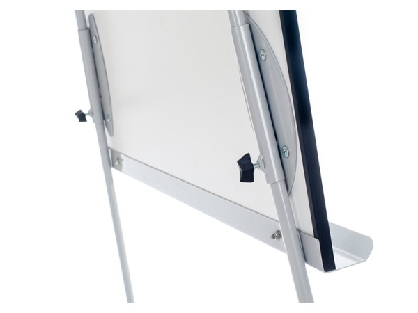 Flipchart s magnetickým povrchem. Flipchart disponuje bočními vyklápěcími lištami pro zavěšení potřebných materiálů.