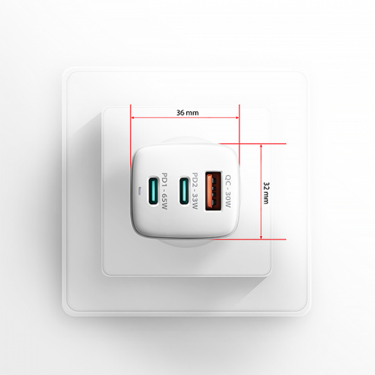 Tělo napájecího adaptéru má příjemný tvar a kompaktní velikost. Ve srovnání s klasickými nabíjecími adaptéry se stejnými parametry je velikost této nabíječky až o polovinu menší. Kombinace malých rozměrů, dosažených pomocí GaN technologie, a širokého rozsahu vstupního napětí, dělá z této nabíječky ideálního pomocníka na cesty. Provoz nabíječky signalizuje elegantní LED dioda.
