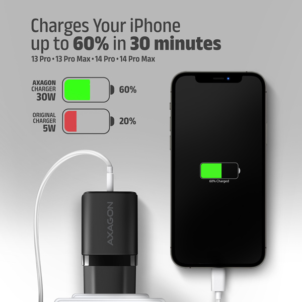 Kompaktní USB nabíječka do sítě AXAGON ACU-PQ30 Sil pro rychlé nabíjení až dvou mobilních zařízení současně. Díky celkovému výkonu 30W nabíječka dobíjí telefony, tablety a další mobilní zařízení nejvyšší možnou rychlostí. Adaptér nabízí nejen standardní USB-A konektor, ale také oboustranný USB-C konektor.