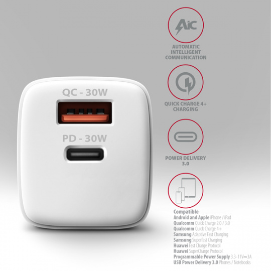 AXAGON ACU-PQ30W Sil nabíječka do sítě 30W, 2x port (USB-A + USB-C), PD3.0/PPS/QC4+/AFC/Apple, bílá