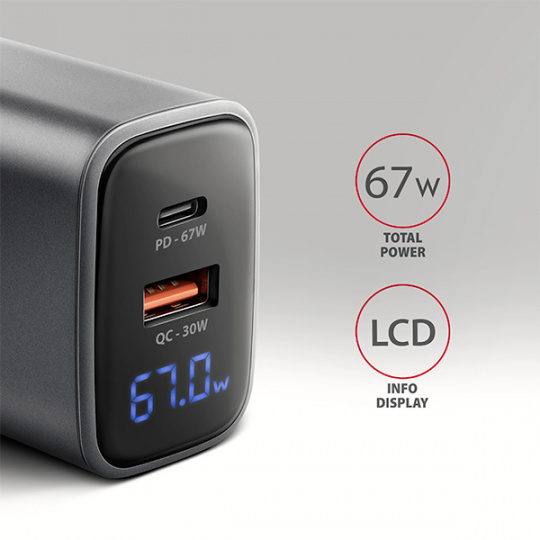 AXAGON ACU-PQ67D, GaN nabíječka do sítě 67W, výstup USB-A + USB-C, PD3.0/PPS/QC4+/SFC2.0/Apple, LCD