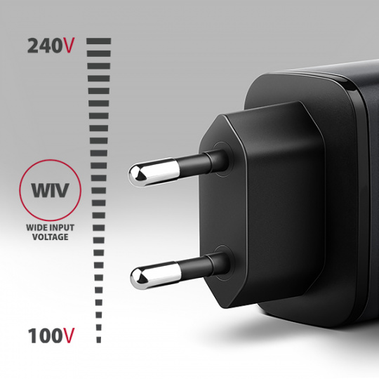 Cestovní nabíječka do sítě AXAGON ACU-PQ67D GaN umožňuje rychlé nabíjení až dvou mobilních zařízení současně. Díky celkovému výkonu 67W dokáže nabíječka dobíjet notebooky, tablety, telefony a další mobilní zařízení nejvyšší možnou rychlostí. Adaptér nabízí nejen standardní USB-A konektor, ale také oboustranný USB-C konektor. Přehledný LCD displej zobrazuje aktuální výkon nabíjení. Kompaktní velikost a vysoký výkon je daný využitím nové GaN technologie. Použité součástky s Nitridem Galia pracují s vysokou účinností, což umožňuje dosahovat vysokých výkonů při malé velikosti. Nabíječka je vybavena výstupem Power Delivery 3.0 / Quick Charge 4+ USB typu C a Quick Charge 3.0 USB typu A, díky čemuž umožňuje rychlé nabíjení nejen smartphonů a tabletů, ale i notebooků. Technologie Quick Charge 4+ umožňuje až 4x rychlejší nabíjení telefonů než běžná USB nabíječka. Technologie Power Delivery 3.0 nejenže podporuje nabíjení moderních telefonů, ale také umožňuje 67W nabíjení moderních notebooků. Apple zařízení podporují rychlé nabíjení, jehož maximální výkon se liší podle konkrétního modelu: iPhone 12-15 podporují nabíjení až 20W, iPhone 16 a 16 Pro až 24W, modely iPhone 13 Pro až 15 Pro a iPhone 17 až 27W. Vyšší výkon nabízí iPhone 16 Pro Max až 30W a iPhone 17 Pro a Pro Max až 40W. Nabíječka je kompatibilní také s iPady a notebooky Apple MacBook Air a Pro. Samsung telefony Galaxy podporují rychlé nabíjení Super Fast Charging až 25W SFC pro řady Galaxy S20-S25 a skládací modely Z Fold a Z Flip. Vybrané modely Galaxy Ultra a tablety Galaxy Tab umožňují ještě rychlejší nabíjení až 45W SFC 2.0. Podporovány jsou také ostatní značky, jako jsou Motorola, Google Pixel, Xiaomi, Honor, Oppo, OnePlus, Realme a další běžné telefony a tablety. Nabíječka je vhodná i pro nabíjení notebooků s technologií PD 3.0 až do 67W, včetně značek Lenovo, HP, Dell, Acer, Asus a dalších. Pokročilý systém ochran na výstupu nabíjecího adaptéru chrání nabíjené zařízení před poškozením. Funkce nabíječky také zajistí rozpoznání nabíjeného zařízení a zvolení optimální rychlosti a průběhu nabíjení. Tělo napájecího adaptéru má příjemný tvar a kompaktní velikost. Ve srovnání s klasickými nabíjecími adaptéry se stejnými parametry je velikost této nabíječky až o polovinu menší. Kombinace malých rozměrů, dosažených pomocí GaN technologie, a širokého rozsahu vstupního napětí, dělá z této nabíječky ideálního pomocníka na cesty. Integrovaný LCD displej přehledně zobrazuje aktuální nabíjecí výkon ve wattech v reálném čase, takže máte snadnou kontrolu nad tím, že připojené zařízení skutečně využívá například rychlé nabíjení. Vstup: • vstupní napětí AC 100V-240V / 1.8A / 50-60Hz (funkce WIV), podporuje více národních napájecích standardů • dvoukolíková euro vidlice - integrovaná v těle napáječe Výstupy: • USB-A port QC (telefony) max. 30W: 5V/3A, 9V/3A, 12V/2.5A, 15V/2A, 20V/1.5A • Technologie nabíjení: QC 3.0, QC 2.0, AFC, SCP, FCP, SMART, Apple 2.4A • USB-C port PD (notebooky, telefony) max. 67W: 5V/3A, 9V/3A, 12V/3A, 15V/3A, 20V/3.35A, PPS: 3.3-11V/5A • Technologie nabíjení: PD 3.0, PD 2.0, PPS, QC4+, QC 3.0, QC 2.0, SFC 2.0, SFC, AFC, SCP, FCP, SMART, Apple PD Maximální výkon nabíječky s použitím více portů: 2 zařízení připojená současně • USB-C port PD = 45W MAX • USB-A port QC = 12W MAX Pozn.: Při současném nabíjení více zařízení si jednotlivá zařízení automaticky rozdělují potřebný výkon. Přidělený výkon se může v průběhu nabíjení měnit. Podporované technologie nabíjení: • Standardní nabíjení všech zařízení s podporou 5V a nabíjení Apple iPhone 5, 6, SE, 7. • SMART - nabíjení max. 5V/4.5A, Quick Charge 1.0, USB Battery Charging 1.2 (DCP 1.5A) a Apple 2.4A (iPad). • FCP - rychlé nabíjení pomocí protokolu Huawei Fast Charge Protocol. • SCP - rychlé nabíjení (až 25W) pomocí protokolu Huawei SuperCharge Protocol. • AFC - rychlé nabíjení pomocí protokolu Samsung Adaptive Fast Charging. • SFC - rychlé nabíjení pomocí protokolu Samsung Super Fast Charging a Super Fast Charging 2.0. • QC - rychlé nabíjení pomocí protokolu Qualcomm Quick Charge 2.0, Quick Charge 3.0 a Quick Charge 4+. • PPS - rychlé nabíjení pomocí protokolu Programmable Power Supply (součást USB PD 3.0 a QC4+). • PD - rychlé nabíjení pomocí protokolu USB Power Delivery 2.0 a Power Delivery 3.0. Příklady podporovaných telefonů, tabletů a notebooků: • SFC - rychlé nabíjení (až 25W) telefonu Samsung Galaxy S20, S21, S22, S23, S24, S25 series, Note 10, 20 series, Z Fold 2, 3, 4, 5, 6, 7 series, Z Flip 3, 4, 5, 6, 7. • SFC 2.0 - rychlé nabíjení (až 45W) telefonu Samsung Galaxy S20, S21, S22, S23, S24, S25 Ultra, Tab S7+, Tab S8+, Tab S9+, Tab S10+, Tab S8 Ultra, Tab S9 Ultra, Tab S10 Ultra • PD - rychlé nabíjení telefonů Apple iPhone 8, 8 Plus, X, XS, XS Max, XR, 11, 11 Pro, 11 Pro Max. • PD - rychlé nabíjení (až 20W) telefonu Apple iPhone 12, 12 Mini, 12 Pro, 12 Pro Max, 12, 12 Mini, 12 Pro, 12 Pro Max, 13, 13 Mini, 14, 14 Plus, 15, 15 Plus, 16 Plus • PD - rychlé nabíjení (až 24W) iPhone 16e, iPhone 16, iPhone 16 Pro • PD - rychlé nabíjení (až 27W) telefonu Apple iPhone 13 Pro, 13 Pro Max, 14 Pro, 14 Pro Max, 15 Pro, 15 Pro Max, iPhone 17 • PD - rychlé nabíjení (až 30W) iPhone 16 Pro Max • PD - rychlé nabíjení (až 40W) iPhone 17 Pro, 17 Pro Max • PD - rychlé nabíjení (až 67W) notebooků Lenovo, HP, Dell, Acer, Asus, Apple MacBook Air, MacBook Pro, iPad mini, iPad Air, iPad Pro a dalších. Nabíječka podporuje funkce WIV, AIC, CC: • Wide Input Voltage - funkce širokého rozsahu vstupního nap
