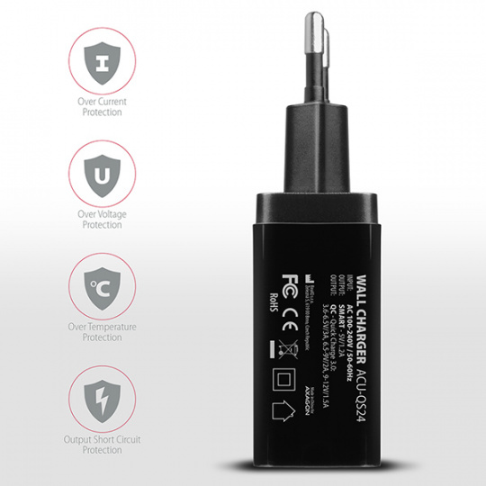 • 1x USB type A port QC: Quick Charge 3.0 - 3.6-6.5V/3A, 6.5-9V/2A, 9-12V/1.5A