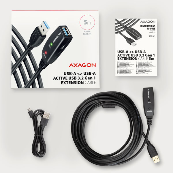 Aktivní prodlužovací USB 3.2 Gen 1 kabel AXAGON ADR-305 délky 5 metrů je ideální k propojení Vašeho počítače s USB zařízením jako je myš, klávesnice, webkamera, tiskárna, skener, plotr a dalšími. Aktivní USB repeater kabel zesiluje průchozí signál a umožnuje připojit USB zařízení na výrazně větší vzdálenost, než Vám umožní pasivní kabel. Dosah kabelu je možné dále prodloužit použitím několika kabelů za sebou. Díky použitému USB 3.2 Gen 1 (dříve USB 3.0) rozhraní si můžete užívat rychlost přenosu dat až 5 Gbps. Tak kabel využijete i na zařízení vyžadující větší rychlost jako jsou zálohovací systémy, datová úložiště NAS a další. Velkou výhodou kabelu ADR-305 je integrovaný konektor přídavného napájení. Ve většině případů postačí napájení po USB sběrnici, avšak u zařízení s větším odběrem může být při větších vzdálenostech USB napájení nedostatečné a přídavné napájení ze sítě může v těchto případech problém vyřešit. Výjimečně kompaktní tělo repeater kabelu dovoluje bezproblémové použití v elektromontážních lištách nebo kabelových systémech. Použití kvalitního stíněného kabelu zaručuje vysokou rychlost komunikace a minimální nežádoucí interference. Vstup: • USB 3.2 Gen 1 pro připojení k počítači • konektor USB typu A (M) male (samec) Výstup: • USB 3.2 Gen 1 pro připojení vzdáleného USB zařízení • konektor USB typu A (F) female (samice) • Přenosová rychlost 5000 / 480 / 12 / 1.5 Mbit/s (super / high / full / low speed) Napájení: • Napájení kabelu i připojených zařízení po USB sběrnici (bus-power mód 5V - 500mA). • Pro většinu připojených USB zařízení je napájení po USB sběrnici dostatečné a není potřeba žádné přídavné napájení. • Aktivní část kabelu obsahuje Micro USB konektor pro přídavné externí napájení 5V/1-2A. • Napájecí kabel USB A-M / Micro USB délky 1.2 m je součástí balení. Kabel umožní napájení z běžné nabíječky mobilních telefonů s USB-A výstupem 5V / min. 1A, např. AXAGON ACU-DS16. • Při napájení repeater kabelu napájecím adaptérem lze připojit i externí 2.5" disk bez potřeby vlastního napájení disku. • U delší USB trasy s několika repeater kabely zapojenými za sebou může být již napájení po USB sběrnici nedostatečné i pro USB zařízení s nižším odběrem než externí 2.5" disk. Také v tomto případě může pomoci posílení napájení připojením napájecího adaptéru. Další vlastnosti: • Plně kompatibilní s USB3.2 Gen1 (USB 3.0) a zpětně kompatibilní s USB 2.0 a USB 1.1. • Plná podpora Plug and Play a Hot Plug. • Dvě LED indikující připojení k napájení a připojení USB zařízení. • Za aktivním USB kabelem může být použit i běžný pasivní USB kabel. • Rozměry aktivní části jsou 75 x 24 x 13 mm, kabel délky 5 m. • Váha 208 g. Podporované operační systémy: • MS Windows XP / Vista / 7 / 8 / 8.1 / 10 / 11 a novější, Windows Server 2003 / 2008 / 2012 / 2016 / 2019 / 2022 a novější (podporovány všechny 32- i 64-bitové verze OS Windows), Mac OS X 10.x a vyšší, Linux s jádrem 2.6.x a vyšším. • Pozn.: Ovladače jsou součástí podporovaných operačních systémů a nainstalují se zcela automaticky. Žádné jiné ovladače není třeba instalovat a nejsou ani k dispozici. Balení v kartonové krabičce obsahuje: • USB 3.0 A-M > A-F aktivní kabel délky 5 m, • USB-A / Micro USB napájecí kabel, • vícejazyčný návod CZ/DE/DK/ENG/ESP/FIN/FR/GR/HR/HU/IT/NL/PL/PT/RO/RU/SK/SWE/BG/CN/TR/ARA.