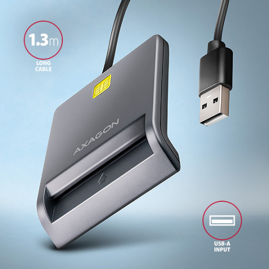 Kompaktní stolní čtečka Smart card / ID card AXAGON CRE-SM3T FlatReader s USB 2.0 rozhraním. Je vhodná zejména jako čtečka občanských průkazů pro použití s počítači, které disponují USB vstupem. Nejrozšířenější USB-A konektor zajistí připojení jak k novému, tak i staršímu počítači.
