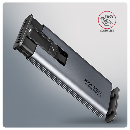 AXAGON EEM2-SD2 USB-C 10Gbps - M.2 NVMe & SATA SSD kovový DISPLAY box, bezšroubkový