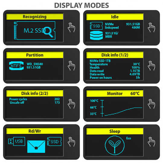 Box je vybaven pokročilým LED displejem, který poskytuje okamžitý přehled o stavu vašeho disku. Nabízí několik režimů zobrazení, včetně detekce připojeného disku, použitého systémového souboru, teploty, zdraví disku, rychlosti přenosu dat a pracovních hodin. Detailní graf umožňuje sledování teploty disku v reálném čase, zatímco režim spánku šetří energii při nečinnosti. S tímto inteligentním monitoringem budete mít svůj disk vždy pod kontrolou - jednoduše, přehledně a efektivně.