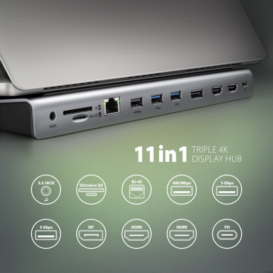 Multiportový USB-C 5Gbps TRIPLE 4K DISPLAY hub AXAGON HMC-4KX3 rozšíří Váš notebook o devět portů a čtečku paměťových karet SD / microSD. Přes oboustranný USB-C konektor snadno a rychle připojíte k počítači až tři monitory, tři USB zařízení, Gigabitovou ethernet síť, sluchátka a čtečku karet současně. Zároveň získáte možnost napájení notebooku pomocí technologie Power Delivery. USB-C hub tak zastane funkci univerzální a výkonné dokovací stanice 11v1 pro moderní notebooky.