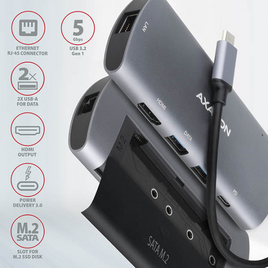 AXAGON HMC-6M2, USB 3.2 Gen 1 hub, 2x USB-A, HDMI, RJ-45 GLAN, SATA M.2, PD 100W, kabel USB-C 18cm
