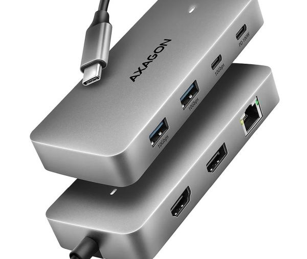 AXAGON HMC-CUB83X2, USB 10Gbps hub, 2x USB-A, USB-C, HDMI & DP 4k/144Hz, RJ-45 GLAN, PD 100W, kabel USB-C 15cm