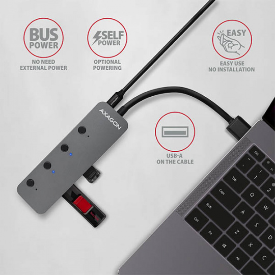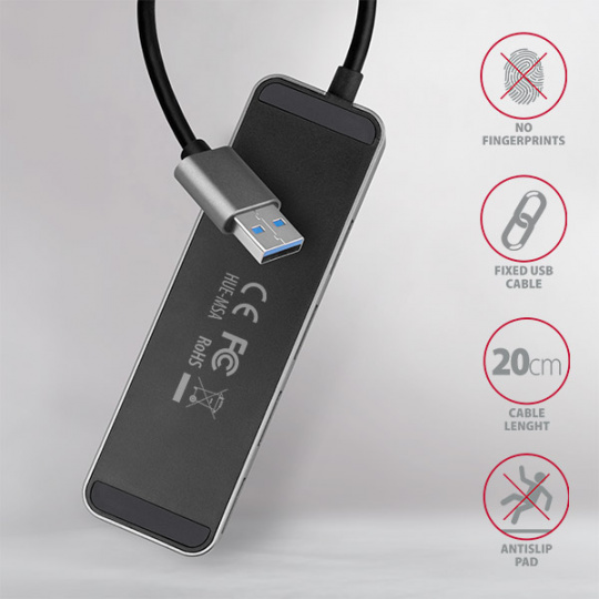 Kovový USB 3.2 Gen 1 (USB 3.0) hub AXAGON HUE-MSA nejen připojí k notebooku nebo počítači až čtyři USB zařízení současně, ale nabízí též vypínání USB portů a funkci Charging hub. Kovové tělo hubu je vyrobeno z hliníku a zajišťuje tak dokonalou mechanickou ochranu pro časté přenášení. Elegantní, jemně strukturovaný povrch brání nežádoucím otiskům. Gumové nožky zabraňují klouzání hubu po stole. Napevno uchycený USB kabel délky 20 cm je ideální pro uživatele mobilních zařízení.
