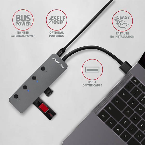 AXAGON HUE-MSA, 4x USB 3.2 Gen 1 SWITCH hub, kovový, micro USB nap. konektor, kabel USB-A 20cm
