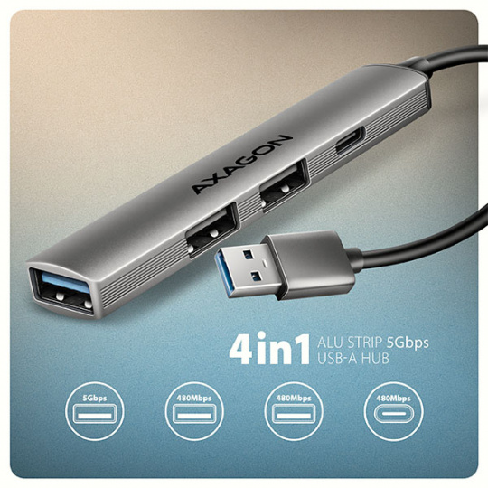 AXAGON HUE-STA, 4x USB ALU STRIP hub, 1x USB-A 5Gbps, 2x USB-A & 1x USB-C 480Mbps, kabel USB-A 12cm