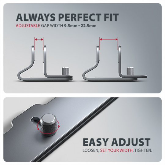 Výhodou je nastavitelné rozpětí stojanu od 9.5 mm do 25.5 mm, díky kterému do něj snadno vložíte většinu notebooků. Nastavenou šířku spolehlivě udrží broušený regulační šroub, který pevně zafixuje požadovanou polohu.