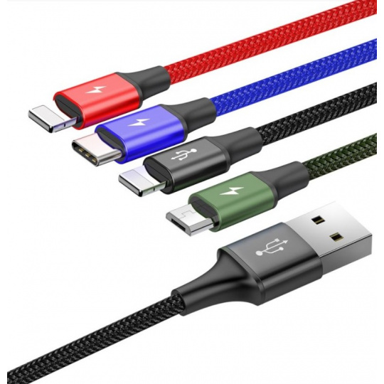 Baseus 4v1 nabíjecí kabel určený pro zařízení s USB-C, Lightning a MicroUSB zařízení.
