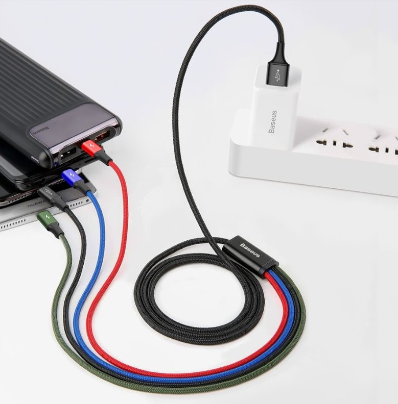 Baseus 4v1 nabíjecí kabel určený pro zařízení s USB-C, Lightning a MicroUSB zařízení.