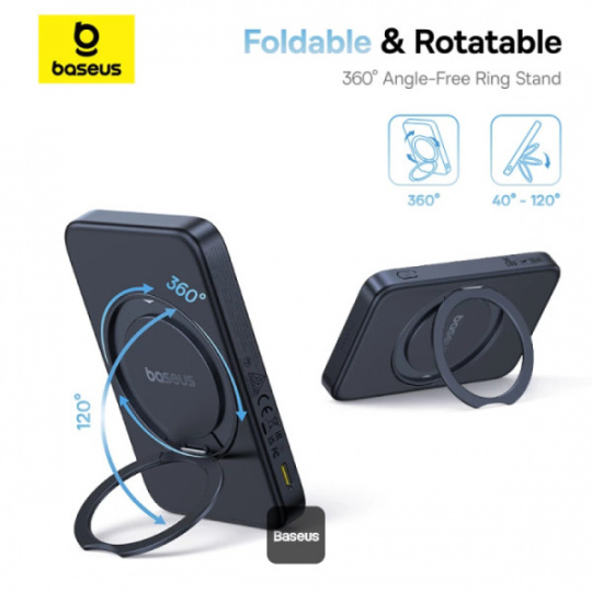 Magnetická bezdrátová powerbanka Baseus PicoGo Qi2 5000mAh, 20W ultratenká rychlá baterie MagSafe s portem USB-C In/Out 15W bezdrátová nabíječka 360° otočný kruhový stojan, lehká nabíječka pro iPhone – černá