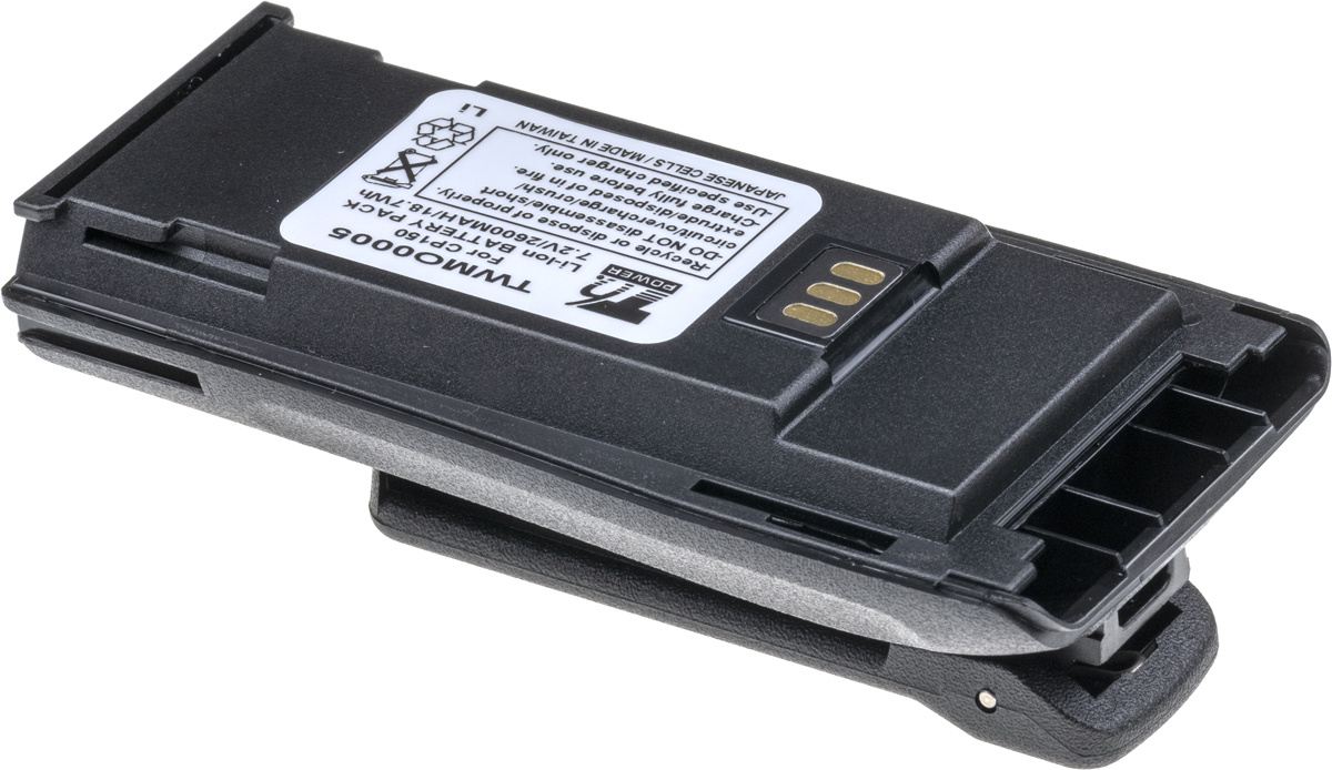 Typ: Li-ion Kapacita: 2600 mAh (18.7 Wh) Barva: černá Napětí: 7.2 V Rozměry: 121x61x34 mm Hmotnost: 160 g Produktová čísla: NNTN4497, NNTN4970, NNTN4851, NNTN4496, H4497-Li, PMNN4253, PMNN4254, PMNN4259 Kompatibilní modely: Motorola CP040, Motorola CP140, Motorola CP150, Motorola CP160, Motorola CP180, Motorola CP200, Motorola CP250, Motorola EP450, Motorola GP3188, Motorola GP3688, Motorola PR400