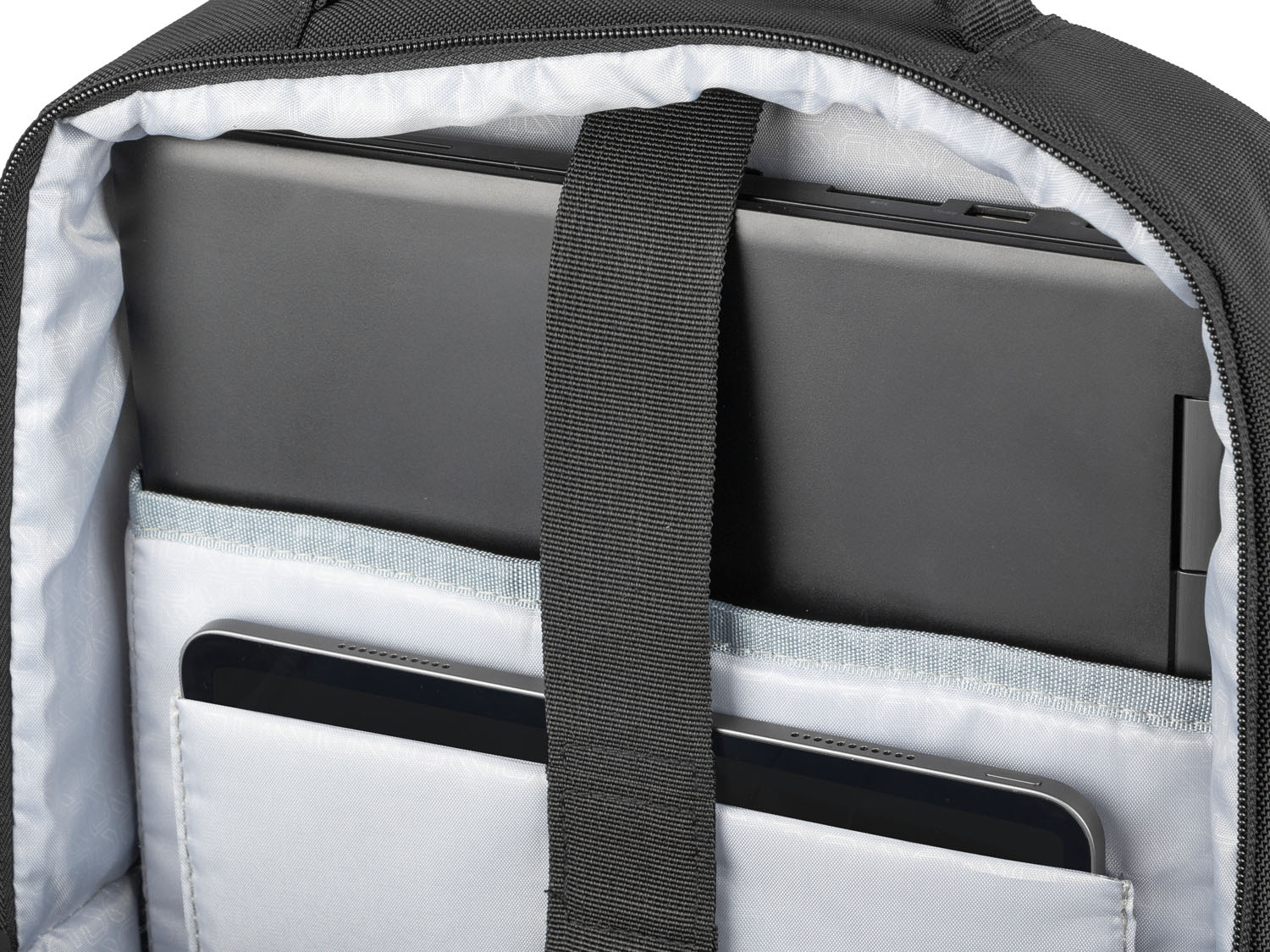 - Hlavní prostor se dvěma polstrovanými kapsami na notebook a tablet se zapínáním na suchý zip chránící zařízení před poškozením.