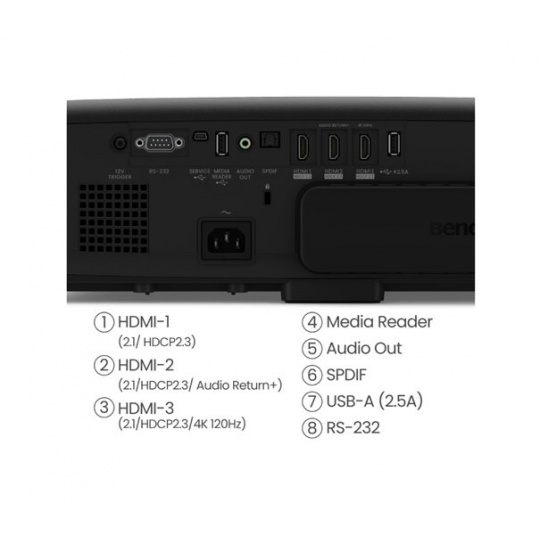 Vstup HDMI: HDMI-1 (2.1/HDCP2.3) (4K 60Hz/ALLM), HDMI-2 (2.1/HDCP2.3) (4K 60Hz/ALLM/Audio Return+), HDMI-3 (2.1/HDCP2.3)(4K 120Hz *downscaling to 1080p 120Hz), (x3), HDMI – interní (2.0b/HDCP2.2)