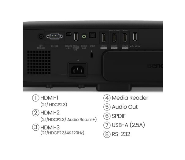 Vstup HDMI: HDMI-1 (2.1/HDCP2.3) (4K 60Hz/ALLM), HDMI-2 (2.1/HDCP2.3) (4K 60Hz/ALLM/Audio Return+), HDMI-3 (2.1/HDCP2.3)(4K 120Hz *downscaling to 1080p 120Hz), (x3), HDMI – interní (2.0b/HDCP2.2)