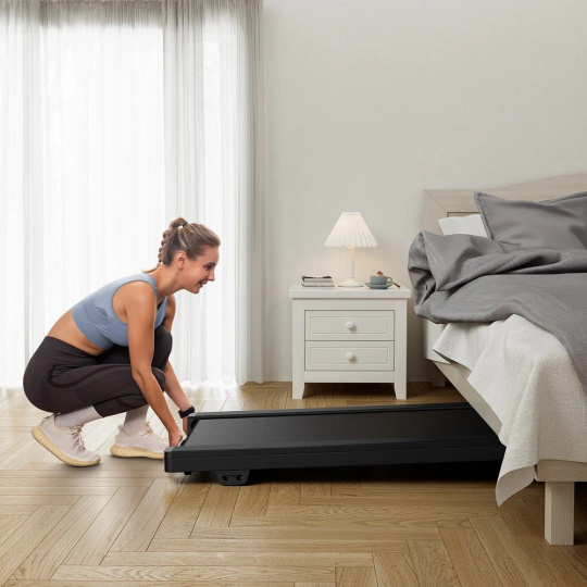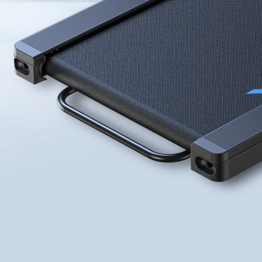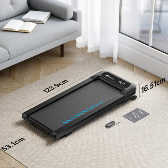 Běžecká plocha o rozměru 40 × 102 cm poskytuje dostatek prostoru pro pohodlnou chůzi. Celkové rozměry 124 × 53 × 16,5 cm a hmotnost 25 kg umožňují snadné umístění i pod pracovní stůl. Nosnost až 120 kg zaručuje stabilitu při každém tréninku.