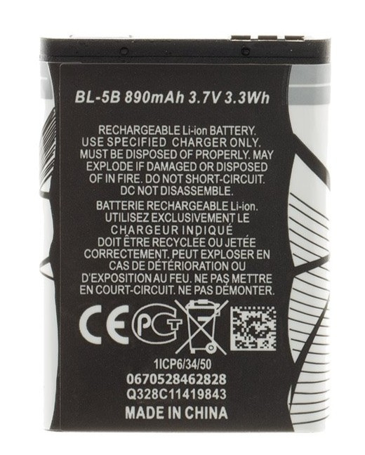 Nokia BL-5B 760mAh Li-Ion (bulk)Nokia 3220, 3230, 5070, 5140, 5140i, 5200 XM, 5300 XM, 5320 XM, 5500 Sport, 6020, 6021, 6060, 6070, 6080, 6101, 6120c, 6121c, 6124c, 7260, 7360, N80, N90