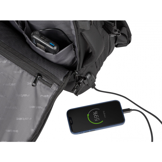 Batoh Natec Camel Pro vám - kromě 3 hlavních komor - zpřístupní 3 kapsy umístěné na přední straně, a dokonce i speciální kapsu na powerbanku. Speciální otvor pro kabel vám umožní připojit zařízení k externímu portu USB a doplnit energii, kdykoli budete chtít. Nabíjíte na cestách? S batohem Natec Camel Pro je to snadnější než kdykoli předtím.