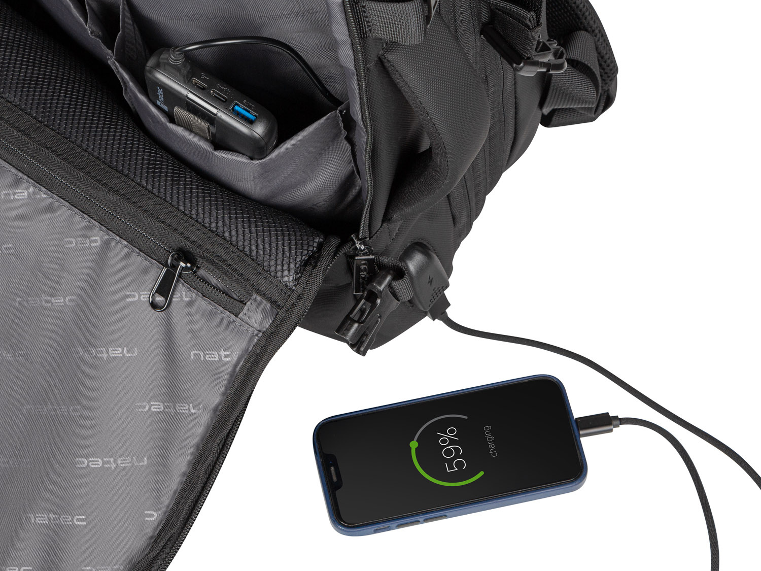 Batoh Natec Camel Pro vám - kromě 3 hlavních komor - zpřístupní 3 kapsy umístěné na přední straně, a dokonce i speciální kapsu na powerbanku. Speciální otvor pro kabel vám umožní připojit zařízení k externímu portu USB a doplnit energii, kdykoli budete chtít. Nabíjíte na cestách? S batohem Natec Camel Pro je to snadnější než kdykoli předtím.