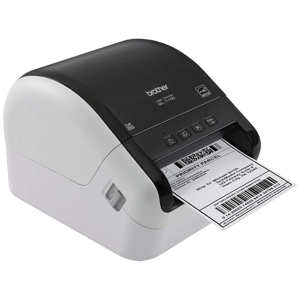 Tiskárna na papírové samolepící štítky nebo filmové role s automatickým odstřihem a šířkou tisku až 102 mm. Tento přístroj je možné použít pouze se spotřebním materiálem společnosti Brother (DK role / štítky).