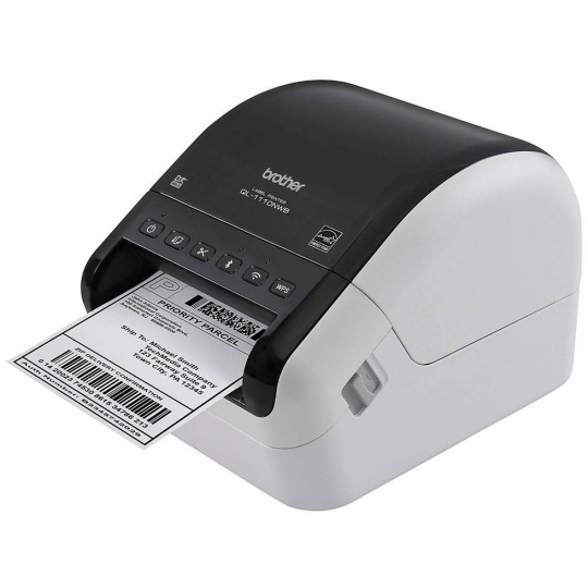 Tiskárna na papírové samolepící štítky nebo filmové role s automatickým odstřihem a šířkou tisku až 102 mm. Tento přístroj je možné použít pouze se spotřebním materiálem společnosti Brother (DK role / štítky).