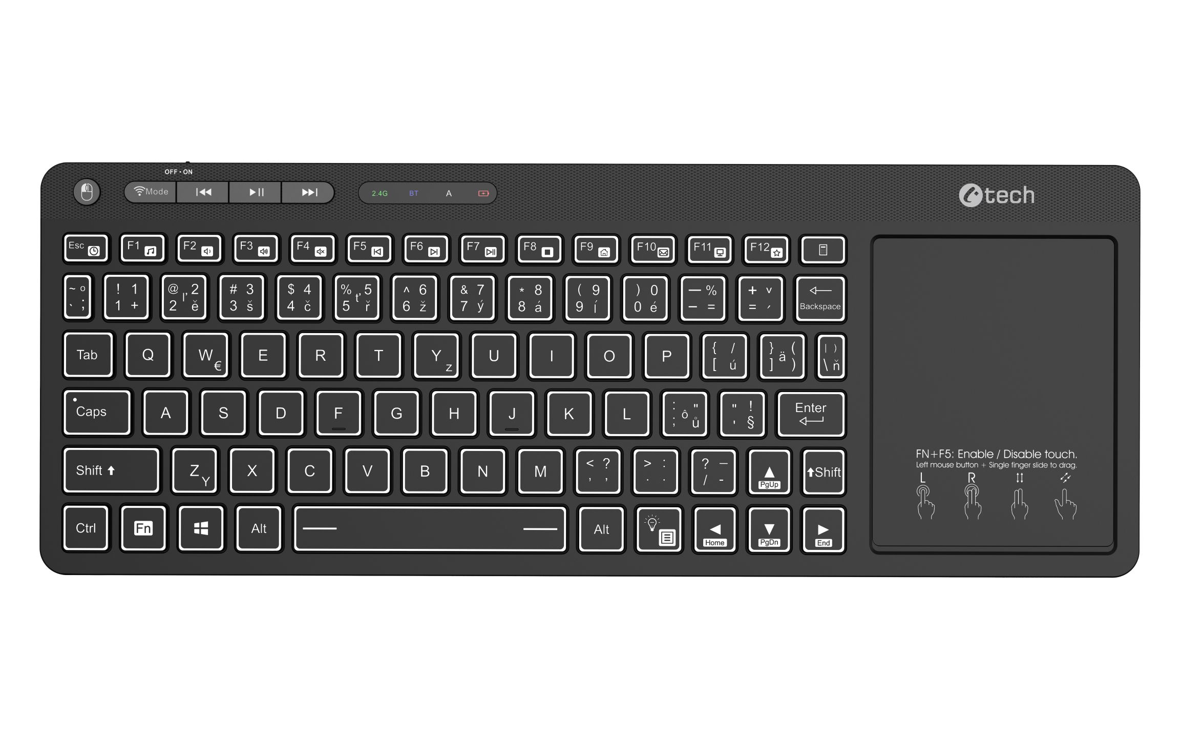 C-TECH klávesnice WLTK-03, Dual mode, BT5.0 + 2,4GHzb, bezdrátová s touchpadem, LED podsvětlení, černá