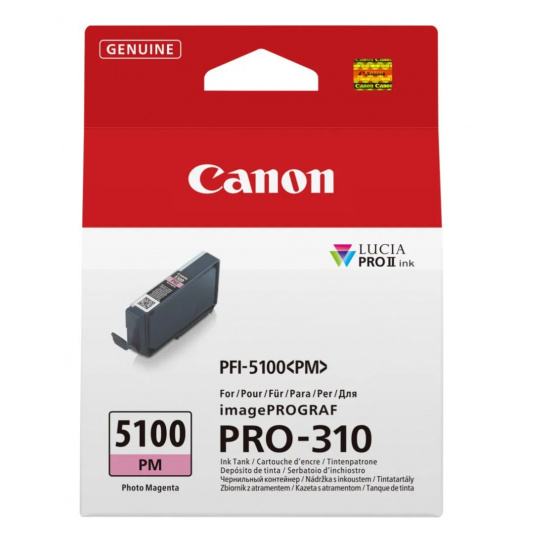 Canon PFI-5100PM foto purpurová Cartridge pro tiskárnu Canon imagePROGRAF PRO-310, 14,4ml Specifikace: Značka tiskárny: Canon Řada tiskárny: ImagePROGRAF Model tiskárny: PRO-310 Barva: Foto purpurová Balení: Jednobarevná náplň