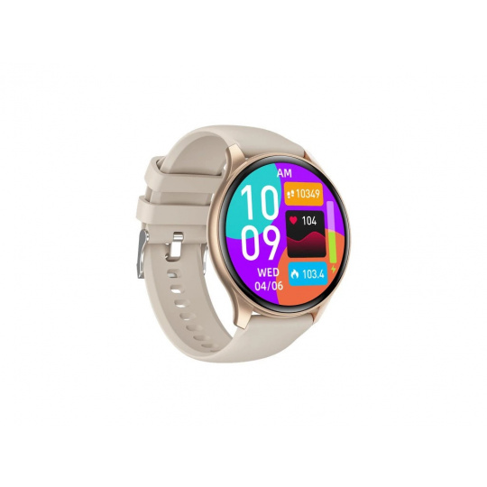 Moderní, fitness hodinky CARNEO Gear Essential druhé generace ve zlaté barvě s béžovým na dotek velmi příjemným silikonovým řemínkem a barevným SUPER AMOLED displejem s vysokým jasem a funkcí trvalého zobrazení času. Monitorují vaši denní aktivitu, úroveň stresu a lze je spárovat s mobilním telefonem a upozornit Vás na příchozí hovor nebo SMS. Hodinky umožňují telefonovat, aniž byste vytáhli telefon z tašky s vestavěným mikrofonem a reproduktorem až do vzdálenosti 10 m od telefonu.