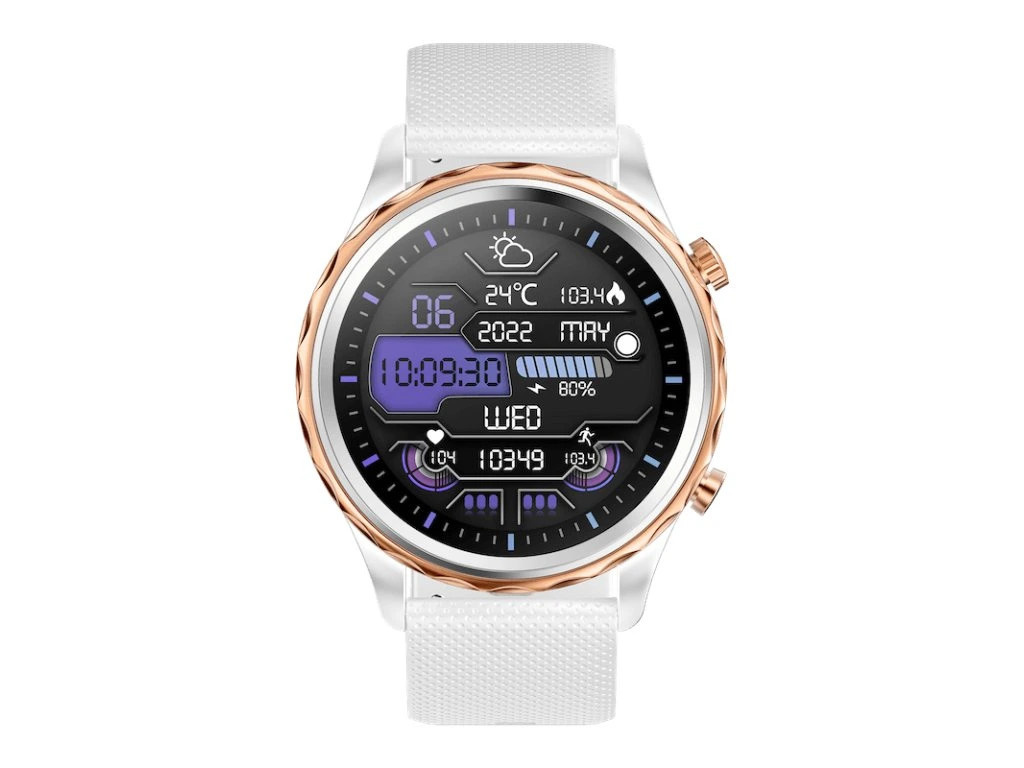 Chytré hodinky Carneo Queen HR+ rosegold Moderní, nadčasové fitness hodinky CARNEO Queen HR+ v bílém provedení se zlatorůžovou korunkou a bílou, na dotek velmi příjemnou, silikonovou páskou a barevným SUPER AMOLED displejem s vysokým jasem a funkcí trvalého zobrazení času monitorují vaši denní aktivitu, úroveň stresu, ale lze je spárovat s mobilním telefonem a upozornit vás na příchozí hovor nebo SMS. Hodinky umožňují telefonovat, aniž byste museli telefon vyndat z tašky, díky vestavěnému mikrofonu a reproduktoru až do vzdálenosti 10 m od telefonu. Jejich bezchybné kovové tělo s nadčasovými outdoorovými křivkami je tak návykové, že je po prvním nošení nebudete chtít sundat ze zápěstí. Mimořádně odolné minerální sklo chrání křišťálově čistou obrazovku před poškrábáním. Operační systém: iOS a Android. Displej - úhlopříčka [palce]: 1,43" dotykový HD AMOLED Displej - rozlišení [pix]: 466 x 466 Materiál řemínku: Silikonový náramek Materiál hodinek: Kov Velikost hodinek: 44 mm Tloušťka hodinek: 11 mm Šířka řemínku: 22 mm Konektivita: Verze Bluetooth: V 5.2, audio V 3.0 Voděodolnost: IP 67 Měřené veličiny: *Krokoměr: ano *Měření vzdálenosti: ano *Měření krevního tlaku: ano *Měření okysličení krve: ano *Měření spálených kalorií: ano *Kardio index: ano *Ůroveň stresu: ano *Výpočet BMI: ano *Monitor Spánku: ano *Energie těla: ano *Aplikace: Carneo FIT v českém jazyce *Přehrávání hudby: Ovládání hudebního přehrávače v mobilním telefonu Baterie: *Životnost baterie: 5 dní *Kapacita [mAh]: 380 mAh Hmotnost [g]: 38 g Obsah balení: *1 x Chytré hodinky CARNEO Queen HR+ *1 x Magnetický napájecí kabel *1 x Uživatelská příručka Záruka: 24 měs.