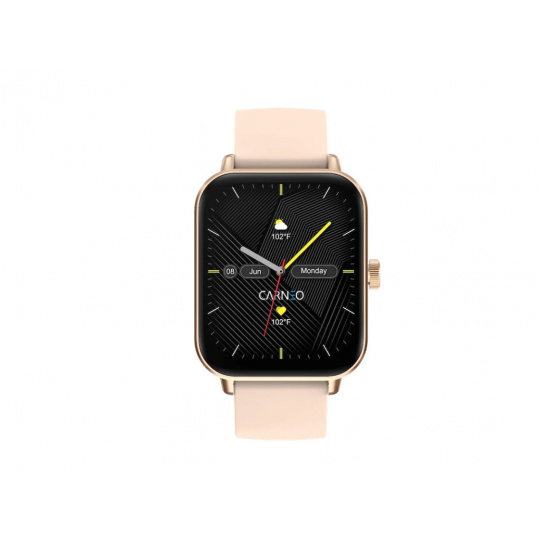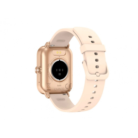 Moderní fitness hodinky Carneo Versa HR+ v elegantním růžovozlatém provedení jsou vybaveny barevným displejem IPS, který lze aktivovat pouhým otočením ruky. Měří tělesnou teplotu, krevní tlak, okysličení krve, srdeční tep, ušlou vzdálenost, monitorují spálené kalorie a kvalitu spánku. Jejich součástí je baterie s výdrží cca 3-5 dní. Podle certifikace IP67 jsou odolné vůči vodě a prachu. Hodinky s podporou technologie Bluetooth jsou kompatibilní s operačním systémem iOS a Android. Silikonový náramek s kovovou přezkou je příjemný na dotek a zaručuje komfort během celého dne.