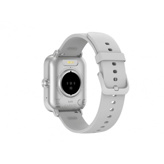 Moderní fitness hodinky Carneo Versa HR+ v elegantní stříbrné barvě mají barevný IPS displej, který lze aktivovat pouhým otočením ruky. Měří tělesnou teplotu, krevní tlak, okysličení krve, srdeční tep, ušlou vzdálenost, monitorují spálené kalorie a kvalitu spánku. Jejich součástí je baterie s výdrží cca 3-5 dní. Podle certifikace IP67 jsou odolné vůči vodě a prachu. Hodinky s podporou technologie Bluetooth jsou kompatibilní s operačním systémem iOS a Android. Silikonový náramek s kovovou přezkou je příjemný na dotek a zaručuje komfort během celého dne.
