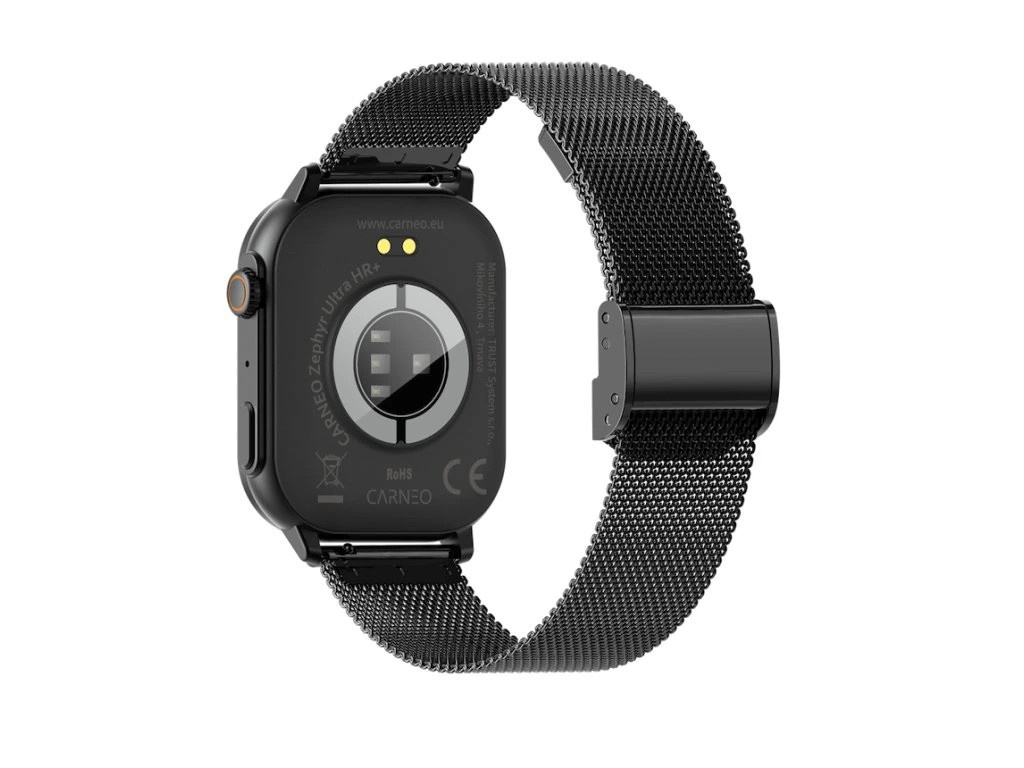 Moderní, designově propracované fitness hodinky CARNEO Zephyr Ultra HR+ v černé barvě s černým, kovovým, pleteným řemínkem a barevným SUPER AMOLED displejem s vysokým jasem a funkcí trvalého zobrazení času. Monitorují vaši denní aktivitu, úroveň stresu a lze je spárovat s mobilním telefonem díky čemuž Vás upozorní na příchozí hovor nebo SMS. Hodinky umožňují telefonovat, aniž byste museli telefon vyndat z tašky, díky vestavěnému mikrofonu a reproduktoru až do vzdálenosti 10 m od telefonu. Jejich bezchybné kovové tělo s nadčasovými outdoorovými křivkami je tak návykové, že je po prvním nošení nebudete chtít sundat ze zápěstí. Tvrzené minerální sklo ochrání jejich křišťálově čistou obrazovku před poškrábáním. Hodinky jsou dodávány se silikonovým řemínkem v černé barvě příjemným na dotek, který jim dodává sportovní vzhled. Vkusný outdoorově-luxusní design se snadno kombinuje k obleku či volnočasovému outfitu. Hodinky i aplikace jsou kompletně v češtině, takže si budete jistě spolu dobře rozumět. Operační systém: IOS a Android Displej - úhlopříčka [palce]: 2,04" dotykový AMOLED Displej - rozlišení [pix]: 368 x 448 Materiál řemínku: Kovový, pletený/ Silikonový náramek Materiál hodinek: Kov Velikost hodinek: 40 x 46 mm Tloušťka hodinek: 10 mm Šířka řemínku: 22 mm Konektivita: Verze Bluetooth: V 5.2 Voděodolnost: IP 67 Měřené veličiny: *Krokoměr: ano *Měření vzdálenosti: ano *Měření krevního tlaku: ano *Měření okysličení krve: ano *Měření spálených kalorií: ano *Kardio index: ano *Úroveň stresu: ano *Výpočet BMI: ano *Monitor Spánku: ano *Energie těla: ano *Aplikace: Carneo FIT v českém jazyce *Přehrávání hudby: Ovládání hudebního přehrávače v mobilním telefonu Baterie: Kapacita [mAh]: 280 mAh Životnost baterie: 7 dní Hmotnost [g]: 38 g Obsah balení: *1 x Chytré hodinky CARNEO Zephyre Ultra HR+ *1 x Magnetický napájecí kabel *1 x Uživatelská příručka