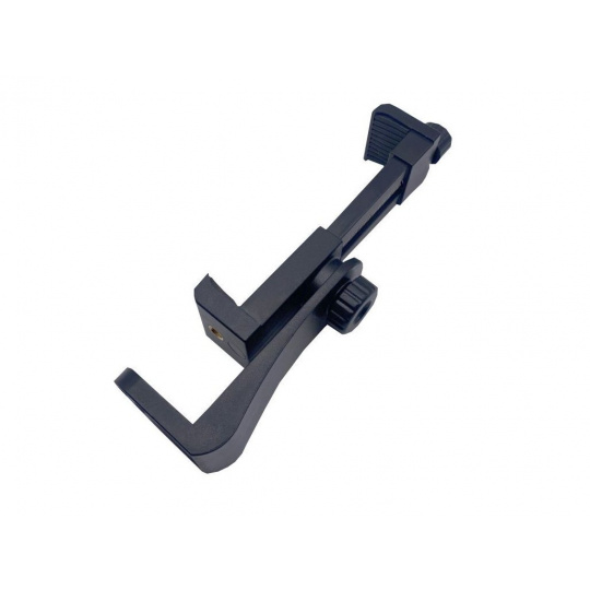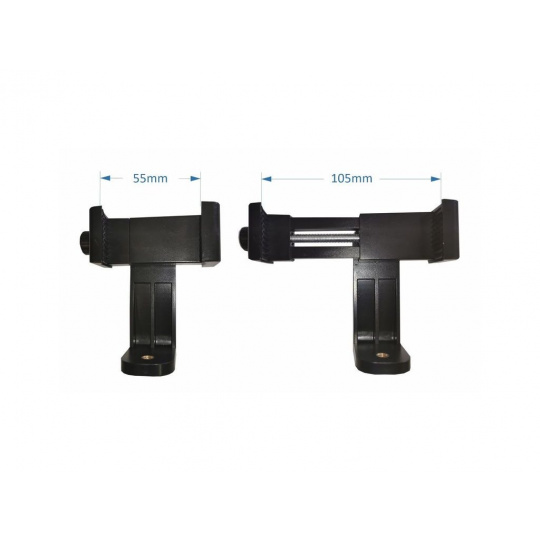 2) Držák pro uchycení mobilního telefonu, kamery nebo fotoaparátu, je také nastavitelný ve všech směrech. Výhodou tohoto speciálního držáku je možnost rozdělení držáku na dva samostatné držáky, a tím dle potřeby měnit nastavení uchycení kamery nebo telefonu, pro ještě lepší úhly a záběry.