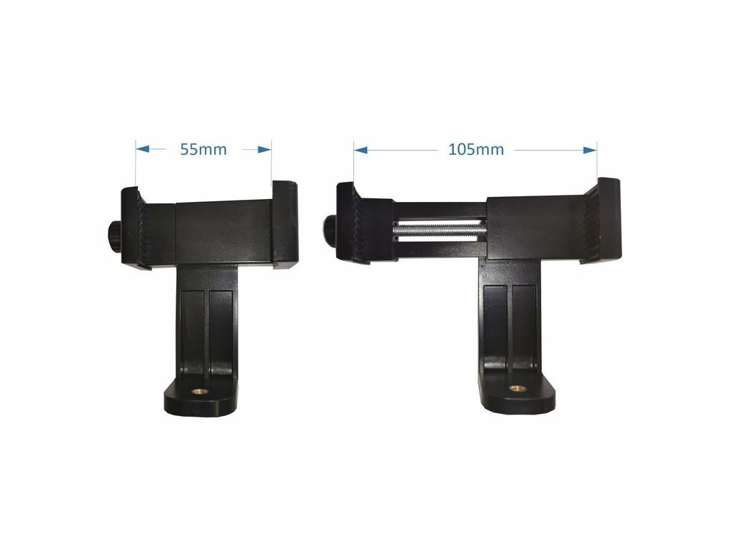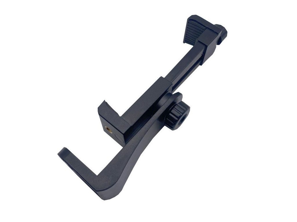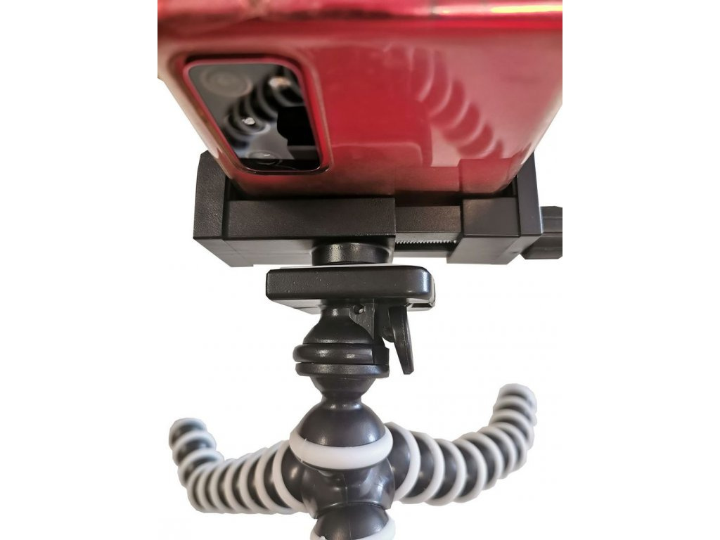 2) Držák pro uchycení mobilního telefonu, kamery nebo fotoaparátu, je také nastavitelný ve všech směrech. Výhodou tohoto speciálního držáku je možnost rozdělení držáku na dva samostatné držáky, a tím dle potřeby měnit nastavení uchycení kamery nebo telefonu, pro ještě lepší úhly a záběry.