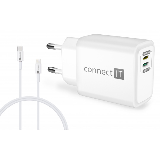 CONNECT IT DUPLEX Nabíjecí adaptér 1xLightning + 1×USB-C, 20W, kabel 27W, BÍLÝ
