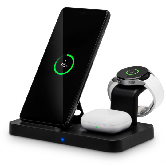 MultiCharge 3v1 Wireless Fast Charge bezdrátová magnetická Qi nabíječka. Podporuje až 15W Qi rychlonabíjení mobilních telefonů, 2.5W Qi nabíjení pro hodinky Samsung a 3W Qi nabíjení pro sluchátka.