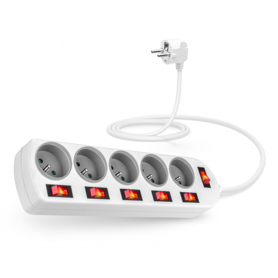 Prodlužovací kabelový přívod na 230 V je vybaven hlavním síťovým vypínačem, který při vypnutí zcela odpojí od přívodu elektrické energie všechny zapojené spotřebiče najednou. Prodlužovací kabel také disponuje s vypínači pro každou zásuvku zvlášť, sami si zvolíte, které zásuvky budou kdy zapnuty nebo vypnuty bez potřeby odpojování připojovacího kabelu od elektrospotřebiče. Extra výbavou je dětská ochrana všech zásuvek – zásuvky jsou přístupné pouze v případě zasunutí obou vidlic najednou, nelze tedy zasunout jednotlivě např. pouze šroubovák nebo pletací jehlici. Díky pootočení zásuvek o 45° je možné používat i objemnější napájecí adaptéry nebo úhlové koncovky.