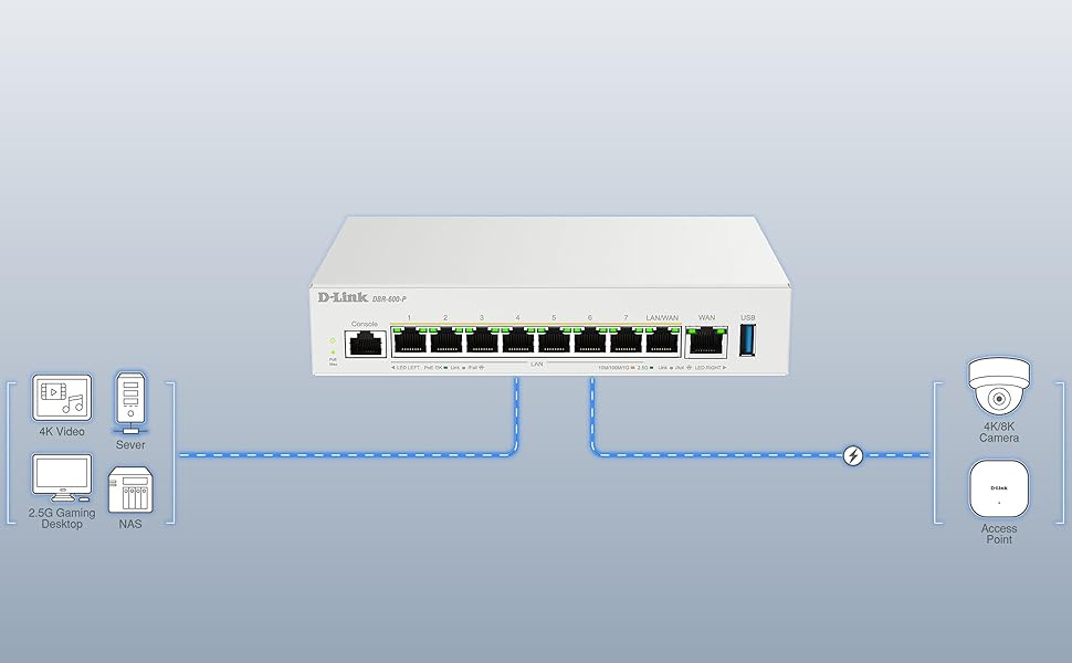 DBR-600-P nabízí vysoce výkonné síťové připojení s 2,5GE WAN portem a osmi 2,5GE PoE porty pro rychlé a spolehlivé připojení.