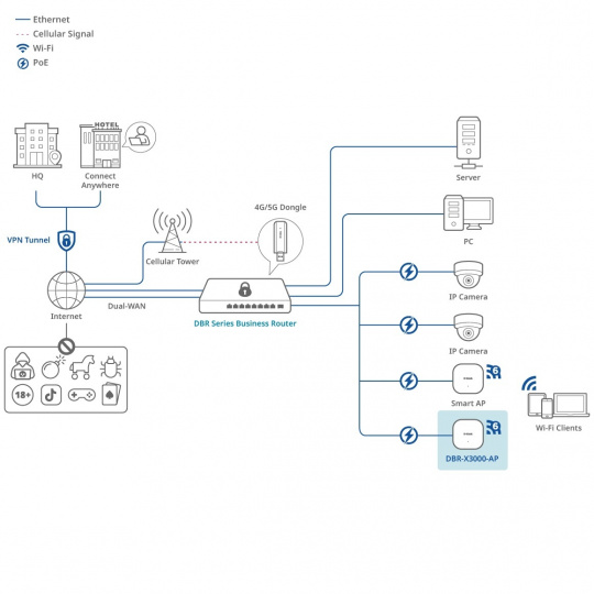 DBR-X3000-AP, navržený pro malé a střední podniky, zajišťuje hladký, vysoce výkonný přístup k internetu pro více uživatelů a zařízení.
