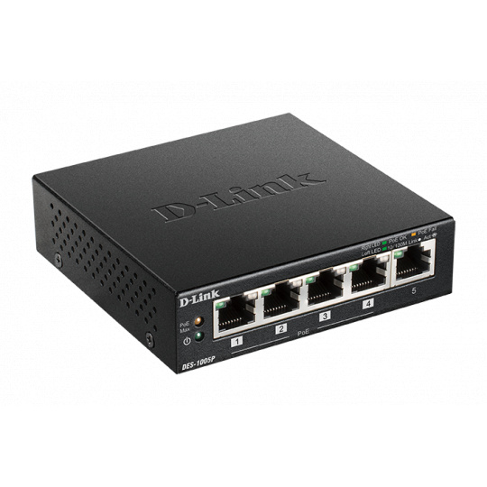 D-Link DES-1005P (revize B1) je 5-portový 10/100M PoE switch bez managementu, jehož první čtyři porty podporují PoE+ napájení 802.3af/802.3at, tj. max. 30W na port. Celkový PoE výkon přepínače je 60W. Ze switche tak lze napájet až 4 PoE zařízení, jako jsou IP telefony, Wi-Fi přístupové body nebo IP kamery. Switch je bez větráků, s externím napájecím adaptérem, v kovovém provedení pro položení na poličku.