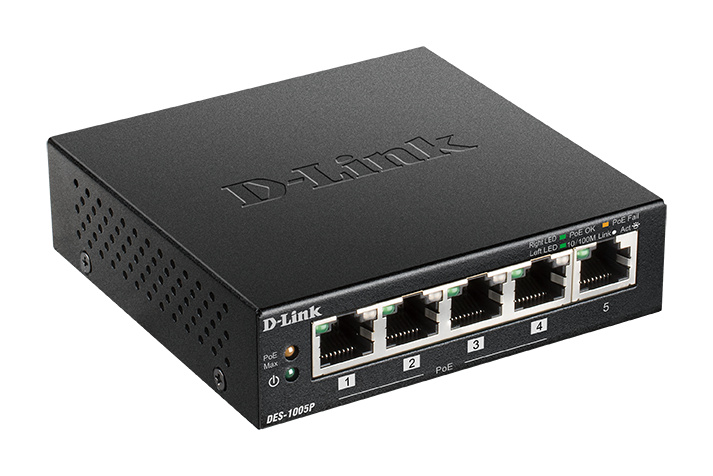D-Link DES-1005P (revize B1) je 5-portový 10/100M PoE switch bez managementu, jehož první čtyři porty podporují PoE+ napájení 802.3af/802.3at, tj. max. 30W na port. Celkový PoE výkon přepínače je 60W. Ze switche tak lze napájet až 4 PoE zařízení, jako jsou IP telefony, Wi-Fi přístupové body nebo IP kamery. Switch je bez větráků, s externím napájecím adaptérem, v kovovém provedení pro položení na poličku.