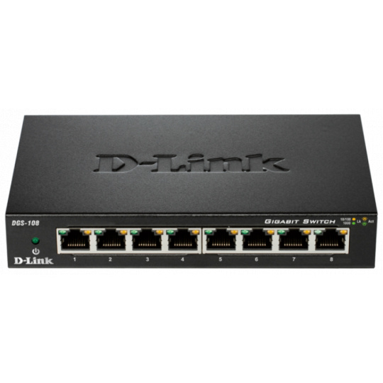 8portový gigabitový neřízený stolní přepínač DGS-108 nabízí ekonomický způsob pro malé a střední podniky a malé a střední podniky, jak těžit ze zvýšené šířky pásma gigabitového Ethernetu. Poskytuje osm gigabitových portů pro snadné rozšíření vaší sítě a rychlý způsob upgradu sítě na gigabitové připojení.